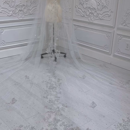 Stock of off white glitter lace with beaded pearl long bridal veil